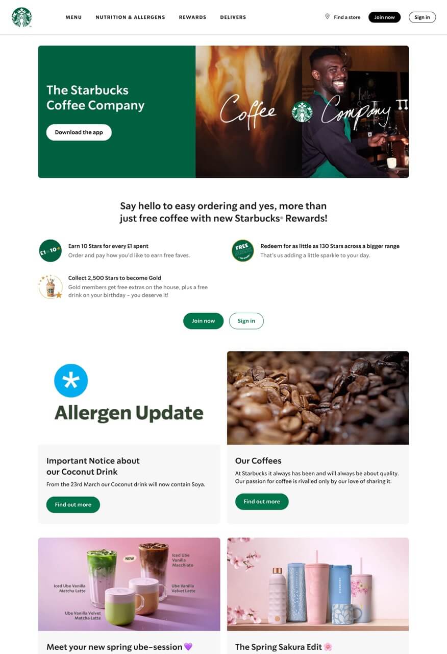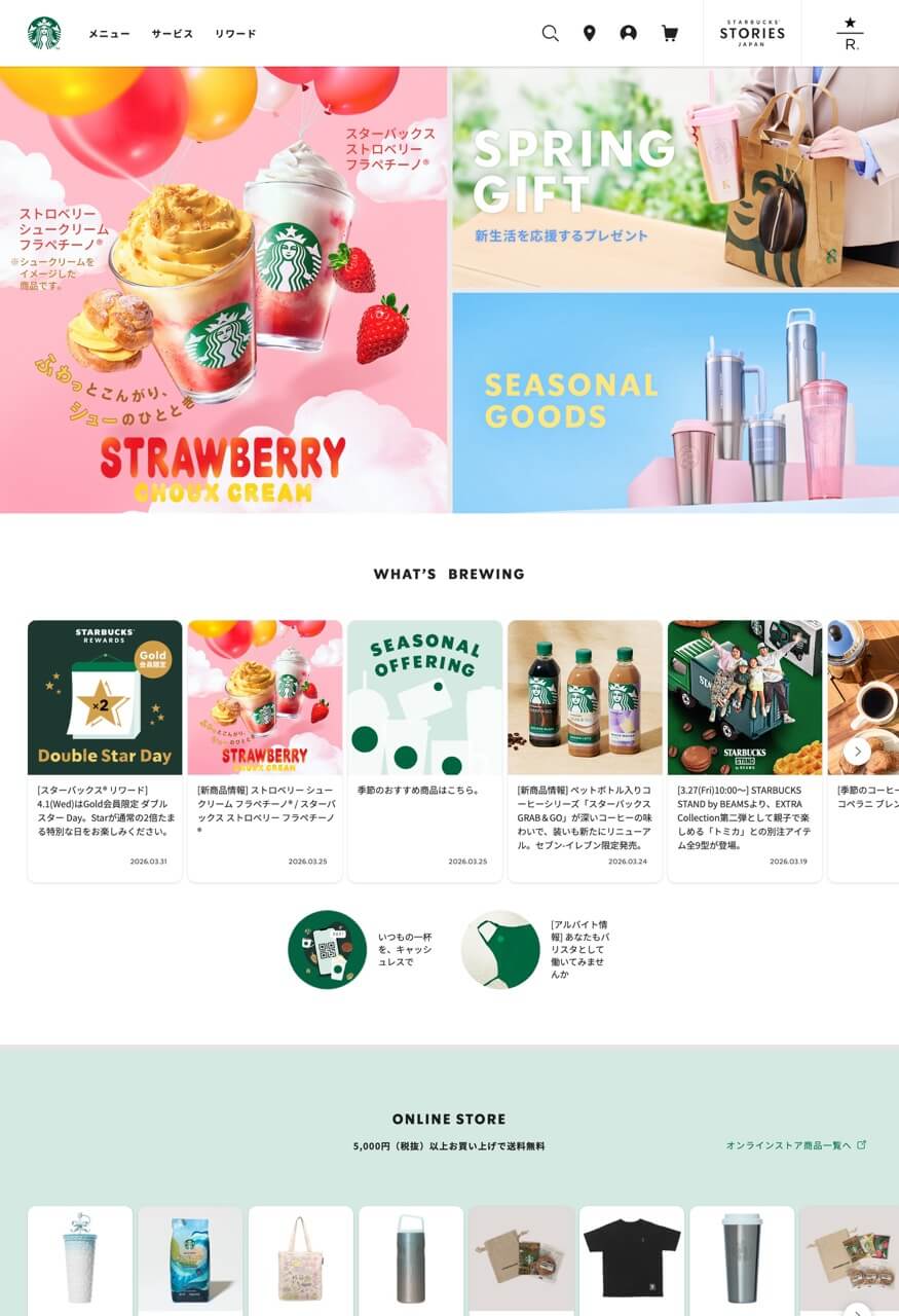 Additional example of context approach / density. The UK Starbucks homepage leads with a single hero image, a clear call to action, and content revealed in distinct, separated blocks — each section asking for your attention one at a time. The Japan version packs the hero area with multiple promotions simultaneously, follows it with a dense horizontal scroll of news and product updates, and moves straight into an online store grid. There's more information above the fold, more visual elements competing for attention, and less negative space.